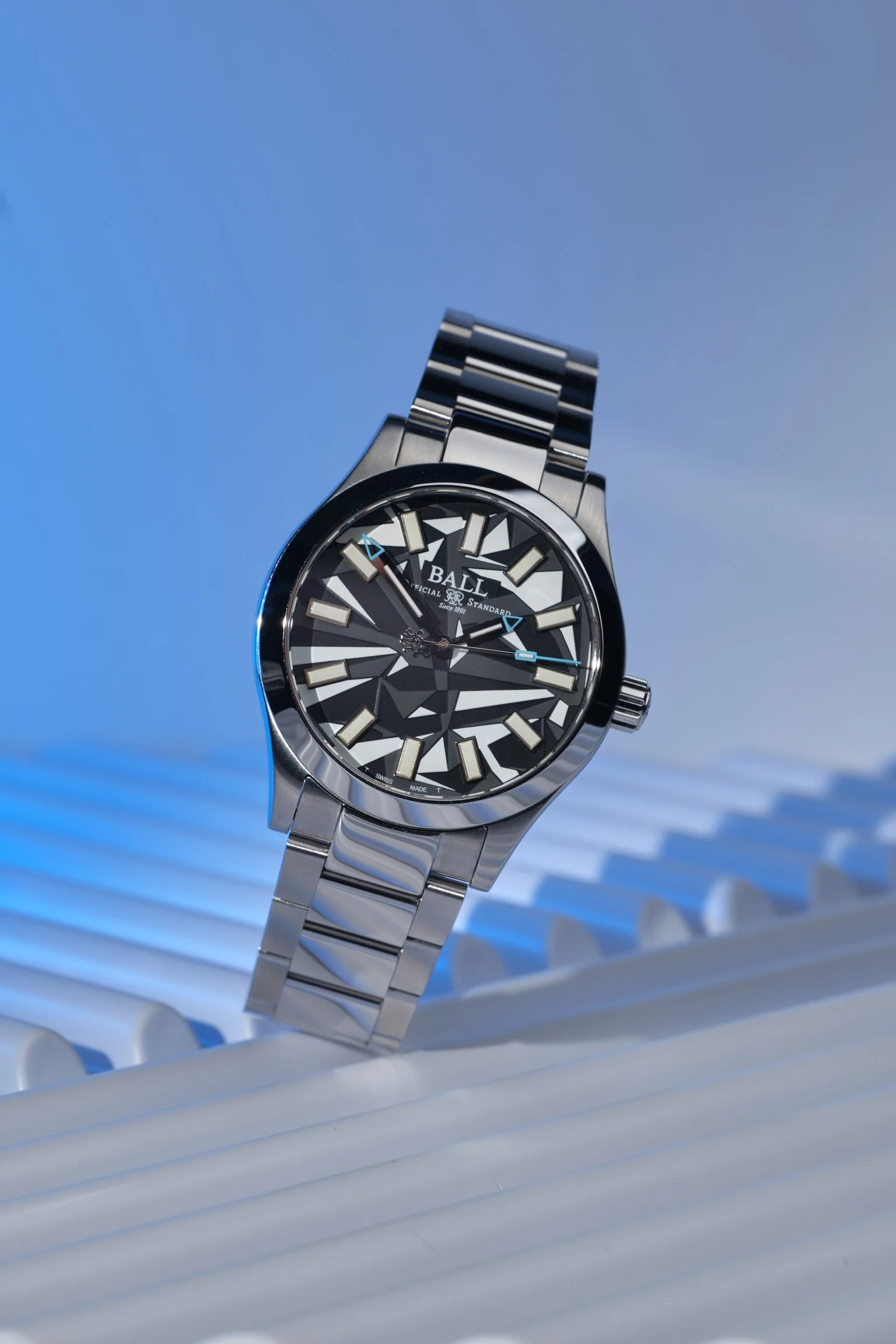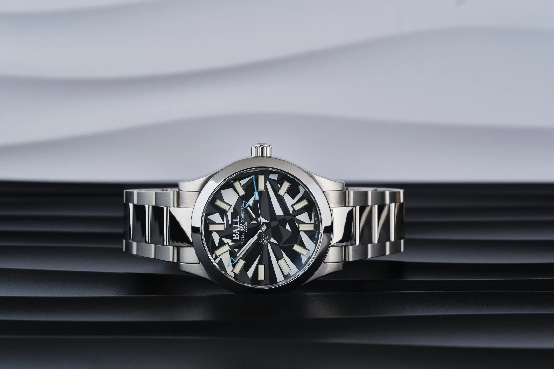 The dial is the headline act here. Angular blocks, high-contrast colours, and fractured geometry create a look that’s deliberately disruptive. It’s busy, yes, but not carelessly so. Spend a few minutes with it and you realise it’s actually very well organised. The hands are bold, the markers are crisp, and the layout is unmistakably Ball. It just happens to look like it’s wearing experimental war paint.