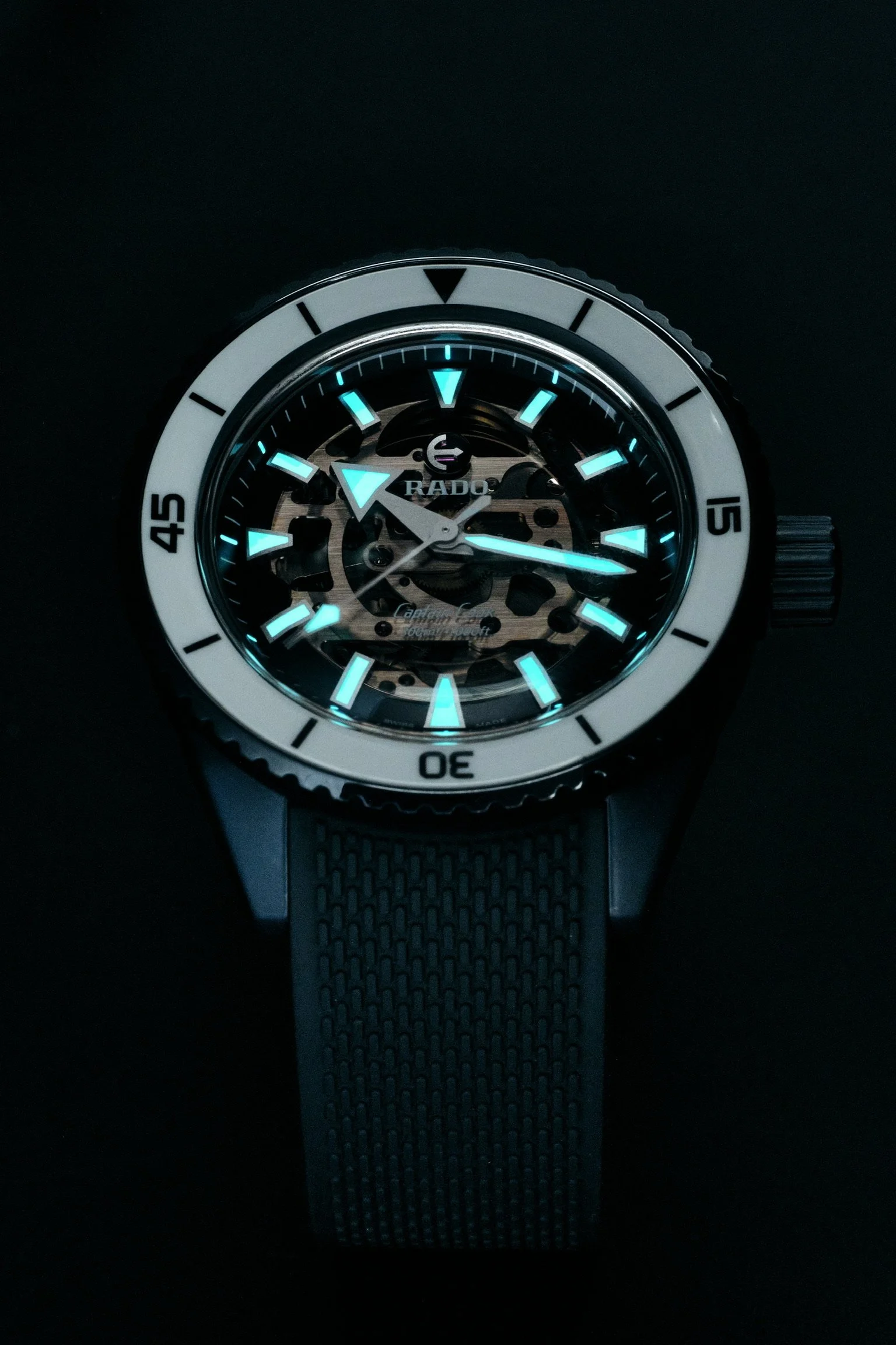 At the forefront of this modern marvel is a polished blue ceramic bezel. Meticulously crafted to shimmer with a deep, rich hue. The bezel's elegant blue contrasts sharply with the pristine white ceramic 60-minute markers. Creating a harmonious and visually appealing ring around the watch's face.This striking combination encircles a skeletonised dial, where intricate inner workings are exposed, offering a glimpse into the watch's precision engineering. Bright white baton hour markers punctuate the dial, providing clarity and ease of reading, while the hands, also in a bold white, stand out crisply against the dark backdrop.The dial’s transparency and the high-tech materials used in its construction highlight both Rado’s commitment to innovation and the timeless elegance of the Captain Cook series.