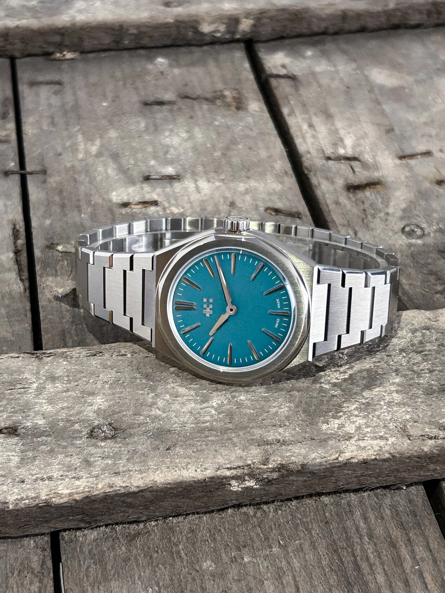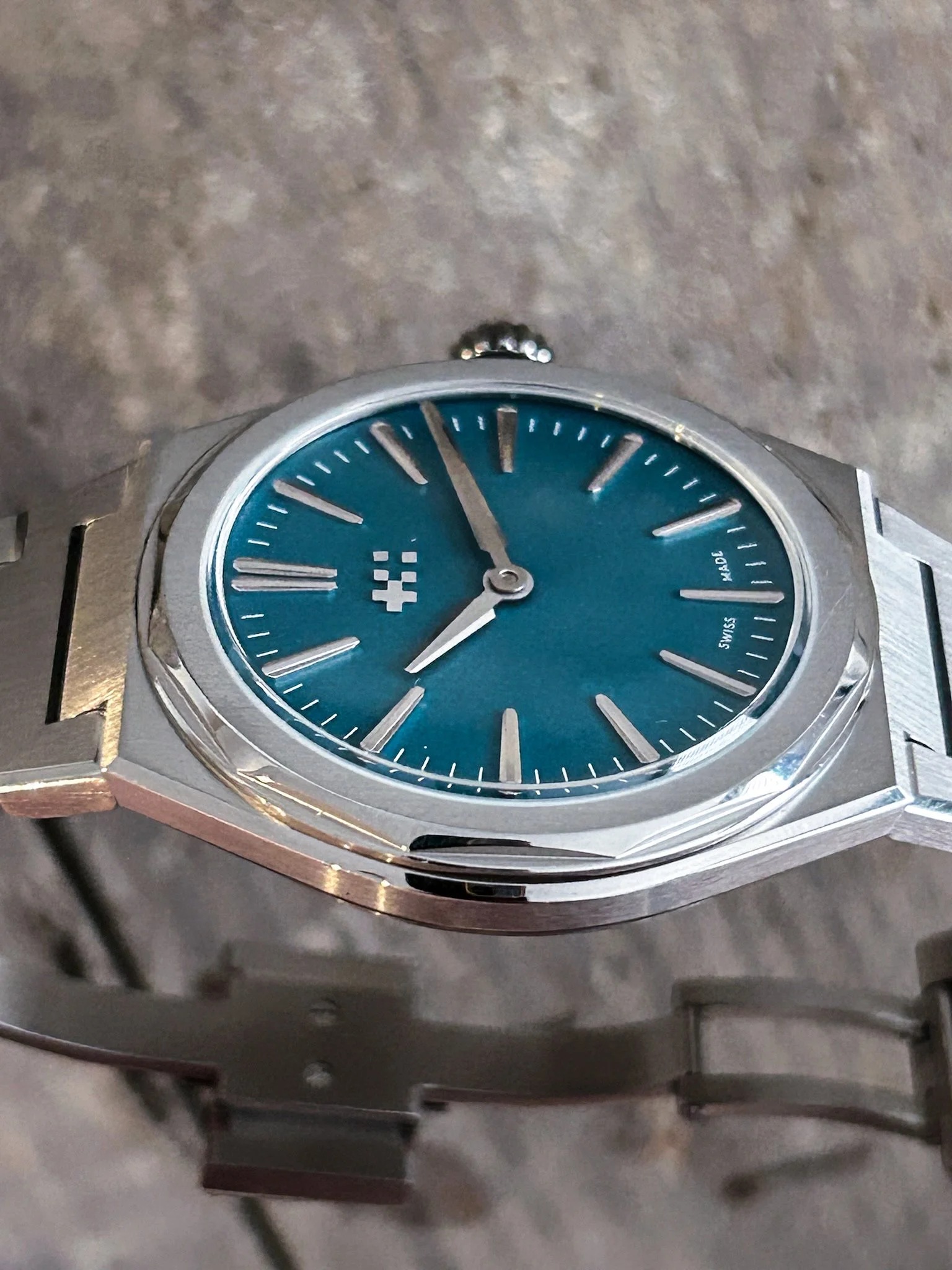 The result? A beautifully balanced 38mm stainless steel case with a sculpted, twelve-sided bezel. Subtle enhancements like sandblasted accents, fine linear brushing, and polished bevels lend depth and dimension. The bezel’s slightly broader frame brings a confident wrist presence to the otherwise featherlight form.