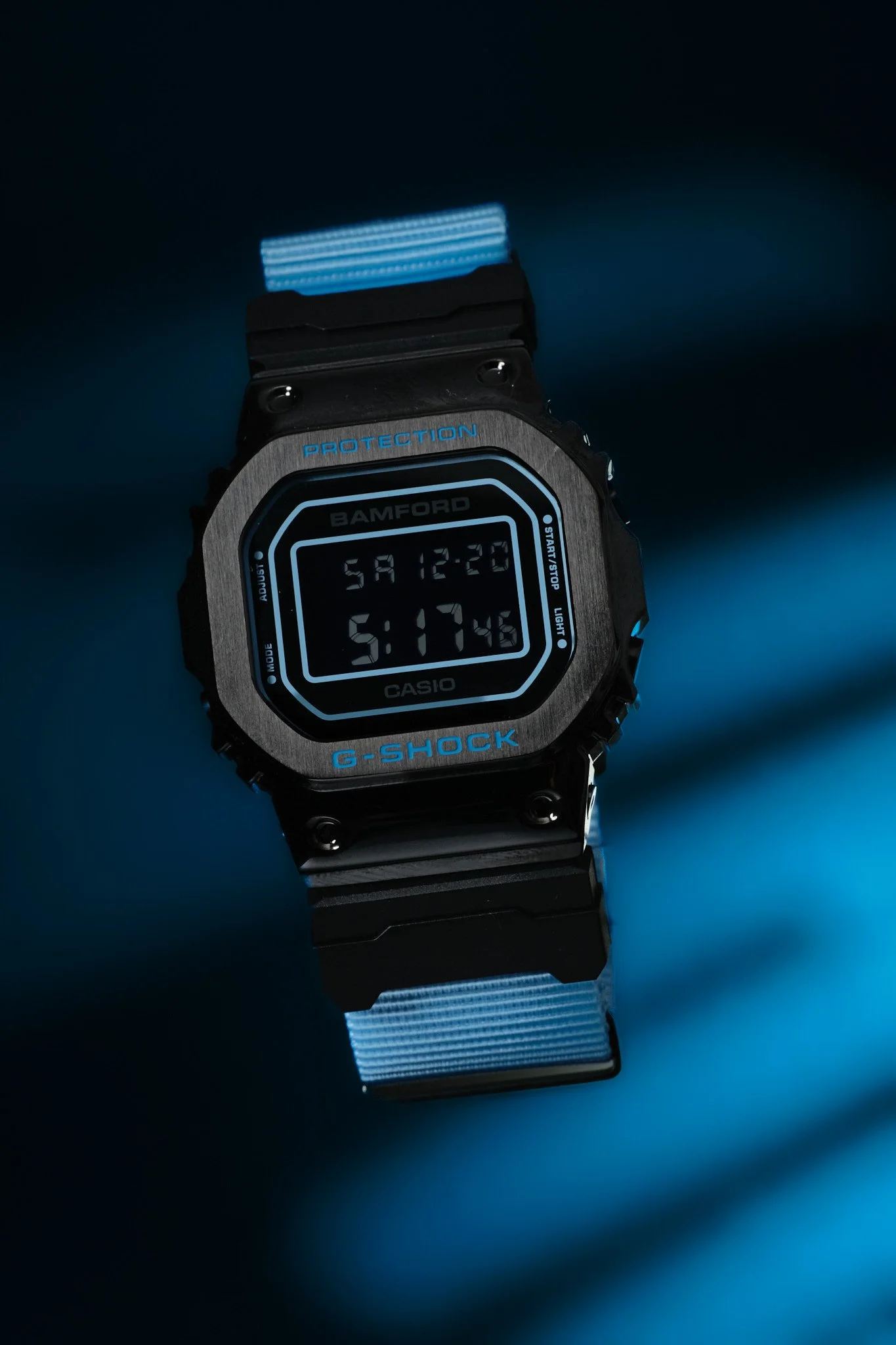 Where this collaboration truly speaks is in the display. Instead of the usual positive LCD, the GM-5600-1 opts for a negative screen with blue-grey numerals, nodding directly to Bamford’s signature colour. Powder-blue touches frame the screen and mark the dial text, while chunky “BAMFORD” and “5600” branding adorn the strap in the same shade, breaking up the near-monochrome palette and asserting the watch’s identity from across the room. It’s unmistakably a G-Shock, but the vibe is less tactical tool and more design object, the sort of digital you can wear with a bomber jacket or a blazer without feeling out of place.