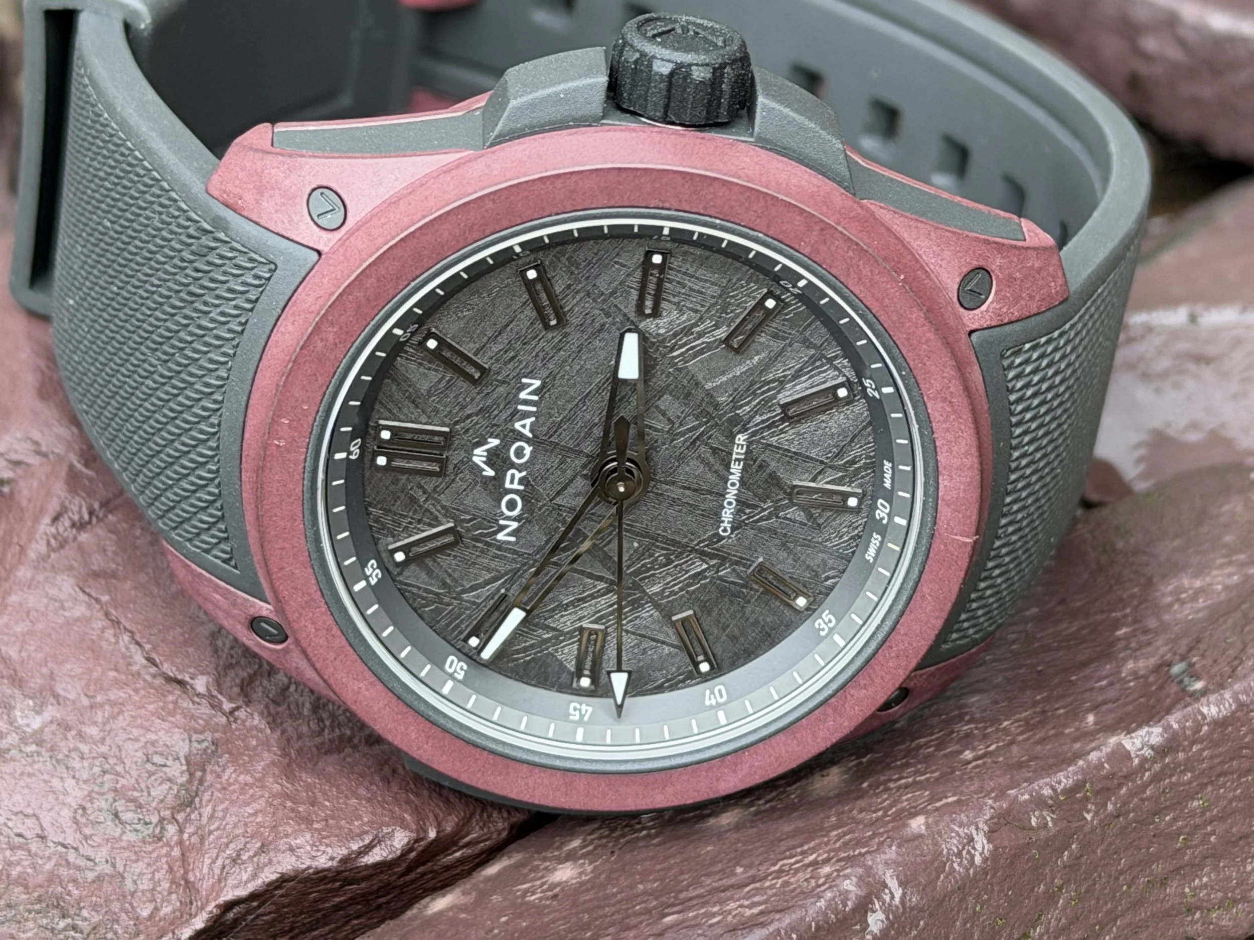 This is the first time Norqain has gone all-in with an anthracite iron meteorite dial, and it’s a strong debut. You get that distinctive Widmanstätten pattern, those icy, interlocking lines that only really pop once the meteorite is properly polished. It gives the whole dial a natural texture that feels almost alive.