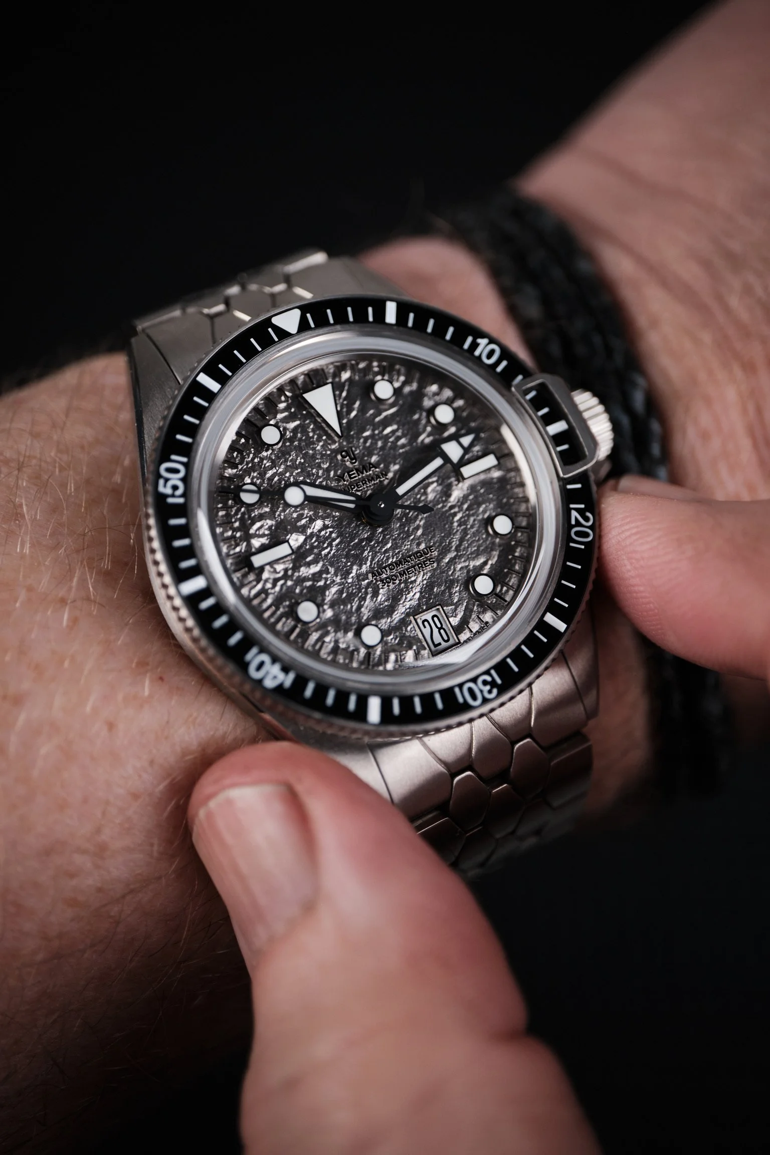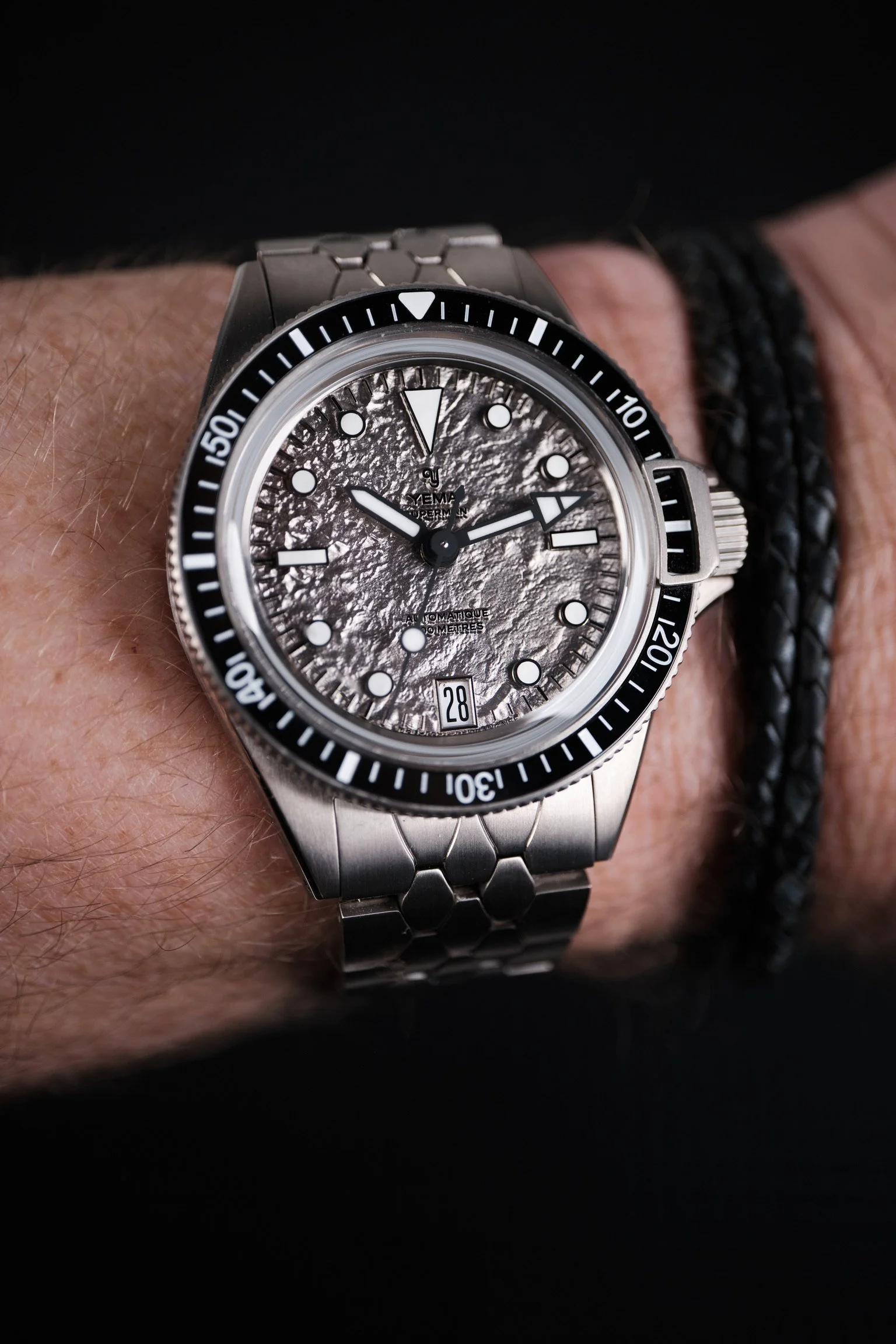 Buyers will have two strap options. The first is YEMA’s updated titanium Scales bracelet, inspired by the original 1960s design. The bracelet has been slimmed slightly, improving comfort while maintaining the distinctive look that collectors will recognise from vintage Supermans. It tapers gently towards the clasp and features a double security folding clasp with a dive extension. Handy if you are planning to strap it over a wetsuit.