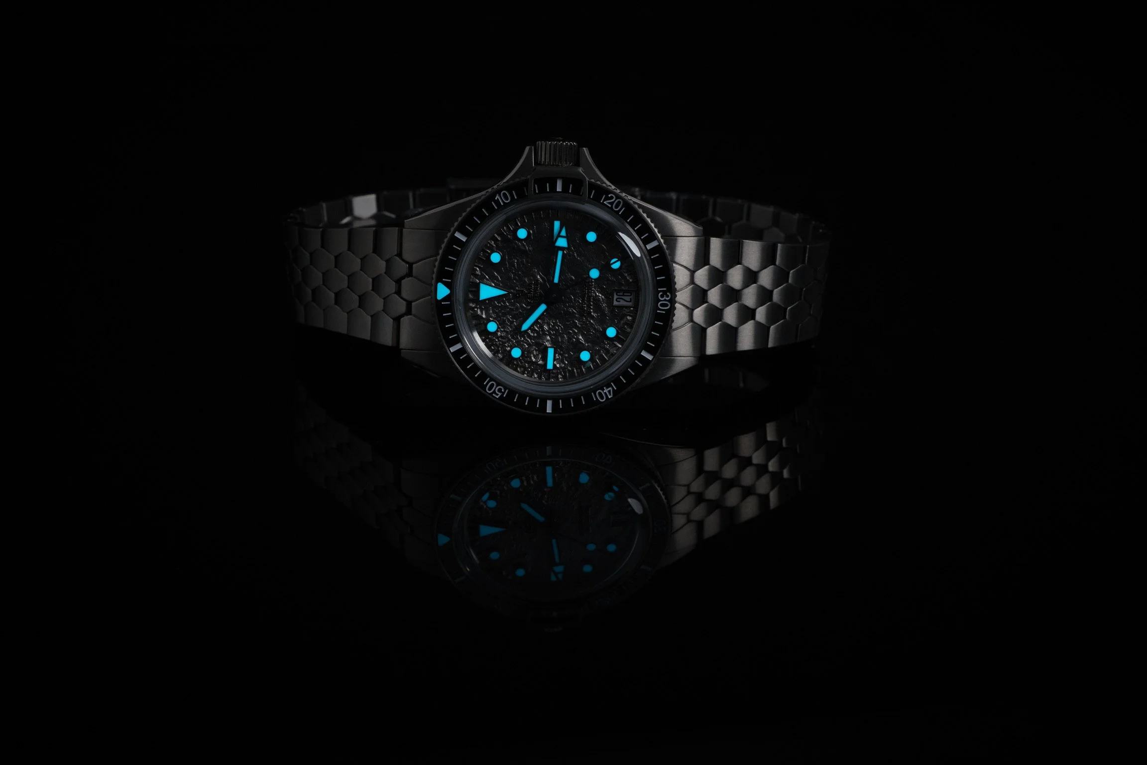 The overall monochrome aesthetic works very well, and when the lume kicks in it really comes alive. The blue glow pops beautifully off the dial, giving the watch a completely different character once the lights go down.