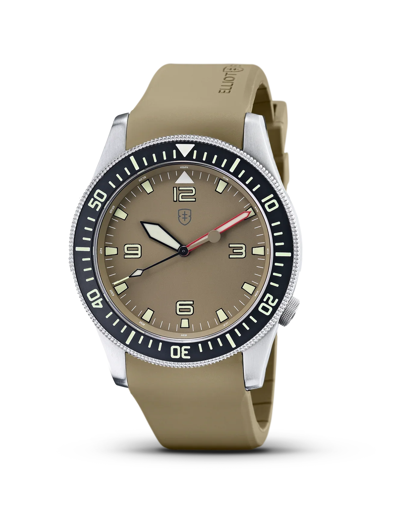 At the more accessible end of the spectrum, but no less compelling, is the Elliot Brown Holton FDE 101-005. This 43mm military watch is unapologetically robust, with a Flat Dark Earth dial that reinforces its utilitarian, field-ready aesthetic.