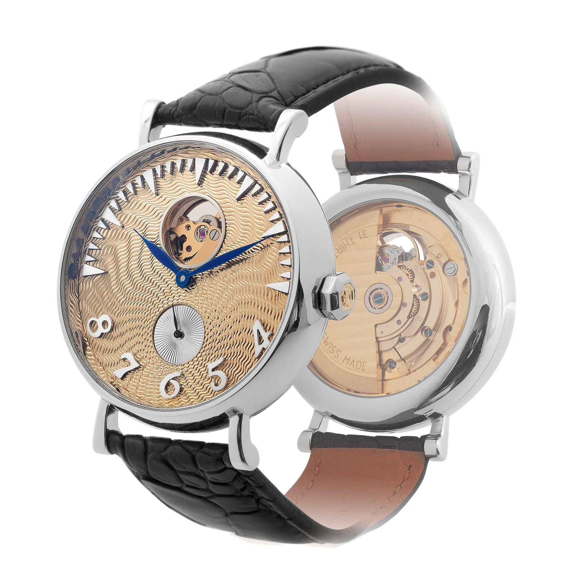 The Justin Richardson Platinum Pebble 1 41 Sunburst is a unique one of one creation that brings together vintage inspiration and contemporary craftsmanship. Its softly contoured platinum case offers an elegant, sculptural presence, while the 18ct yellow gold dial features an engraved guilloché sunburst radiating from a silver sub seconds display. A beating heart aperture reveals the movement, adding a sense of mechanical theatre.