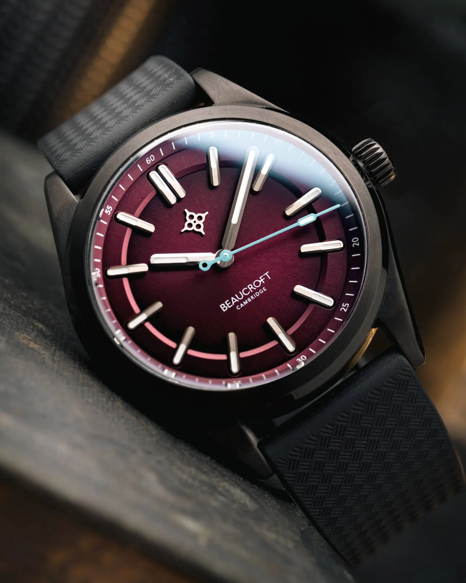 The Rebel Red features a sleek tungsten carbide carbon coated black case paired with a deep red gradient dial that shifts beautifully as the light changes. The rich gradient, sunburst finish, and distinctive colour give the dial real depth, while Beaucroft’s soft blue gloss seconds hand adds a welcome flash of personality. A matching black rubber strap completes the look, delivering a seamless and refined aesthetic.