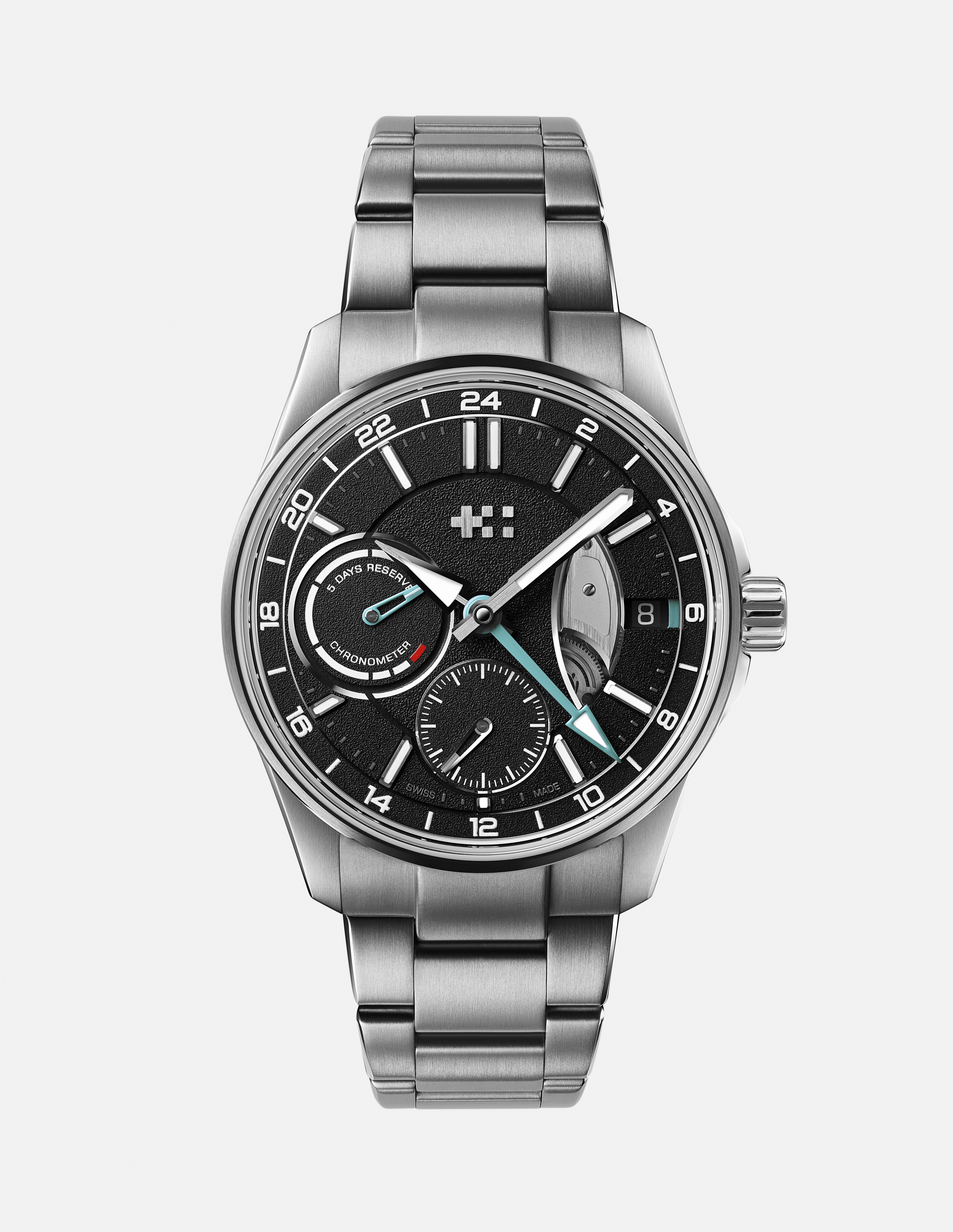 The watch is housed in a 40.5mm Light-catcher™ stainless steel case, featuring a mix of brushed and polished finishes and fitted with box-domed sapphire crystals front and back. Despite an overall height of 14.15mm, the domed crystals help reduce its perceived thickness on the wrist, while 100 metres of water resistance ensures everyday versatility. Completing the package is Christopher Ward’s Bader bracelet, with polished bevels and a push-button micro-adjust clasp, alongside the option of a colour-matched integrated rubber strap.